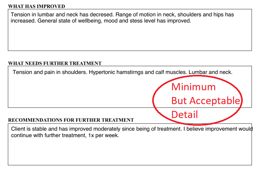 How much detail to include? If the client has done a good chunk of treatments, then its appropriate to include a fair level here. Below are some examples of different levels of detail. (The examples are from when we used to use paper forms but they still apply)